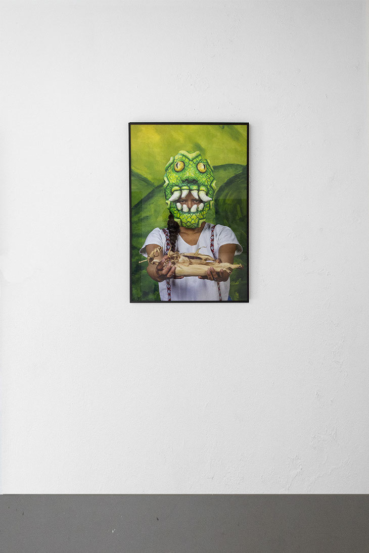 In Kontoy 2020, the artist researched on different Ayuuk communities in Oaxaca, the myths about the travels and evidence of Kontoy and its twin sister Tajëëw, the serpent. The cosmogonic narratives about Kontoy and Tajëëw recount them as twin deities that were born from an egg in a Mountain/Cave/Lagoon. Their conception as multisignificative entities manifest them with zoomorphic properties and the ability to transit over the terrestrial, aquatic and celestial domains; Kontoy, credited with creating the hills, cliffs, plains, lagoons and rivers in the Ayuuk Territory, has extra-human attributes; a jaguar foot and a avian foot (turkey), it has as well as the ability to move with the wind and dominate rain and thunder as its nagual (shape-shifting force). Tajëëw the serpent, is associated with the earth, rivers, ravines and abysses, it has the ability to move within the earth, her movements are related to earthquakes and the rainbow.