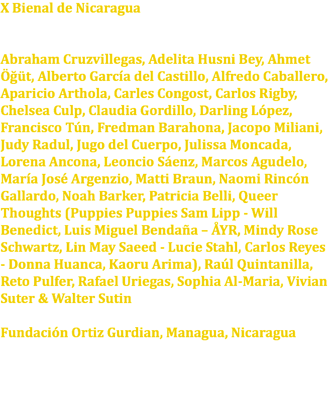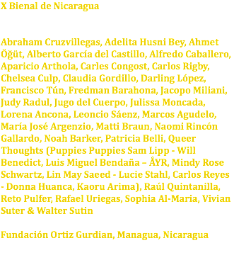 X Bienal de Nicaragua Abraham Cruzvillegas, Adelita Husni Bey, Ahmet Öğüt, Alberto García del Castillo, Alfredo Caballero, Aparicio Arthola, Carles Congost, Carlos Rigby, Chelsea Culp, Claudia Gordillo, Darling López, Francisco Tún, Fredman Barahona, Jacopo Miliani, Judy Radul, Jugo del Cuerpo, Julissa Moncada, Lorena Ancona, Leoncio Sáenz, Marcos Agudelo, María José Argenzio, Matti Braun, Naomi Rincón Gallardo, Noah Barker, Patricia Belli, Queer Thoughts (Puppies Puppies Sam Lipp - Will Benedict, Luis Miguel Bendaña – ÅYR, Mindy Rose Schwartz, Lin May Saeed - Lucie Stahl, Carlos Reyes - Donna Huanca, Kaoru Arima), Raúl Quintanilla, Reto Pulfer, Rafael Uriegas, Sophia Al-Maria, Vivian Suter & Walter Sutin Fundación Ortiz Gurdian, Managua, Nicaragua